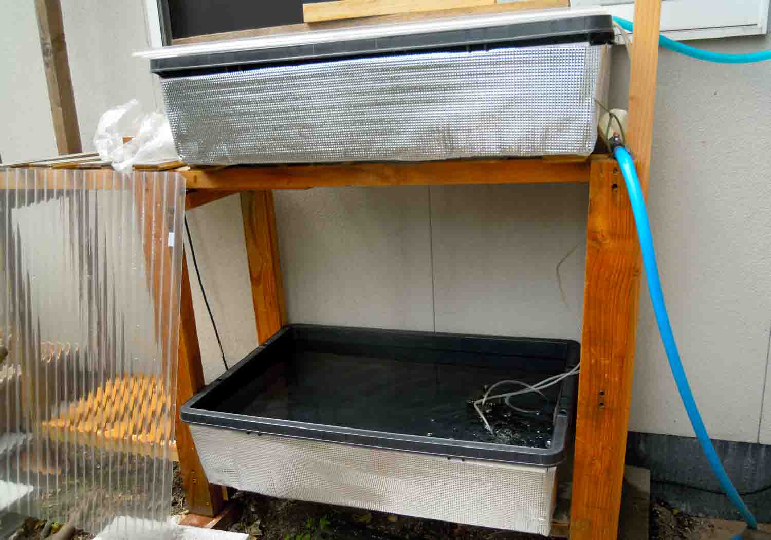 自転車置き場でトロ舟を上下に置いて使っていた2段の棚を元に、