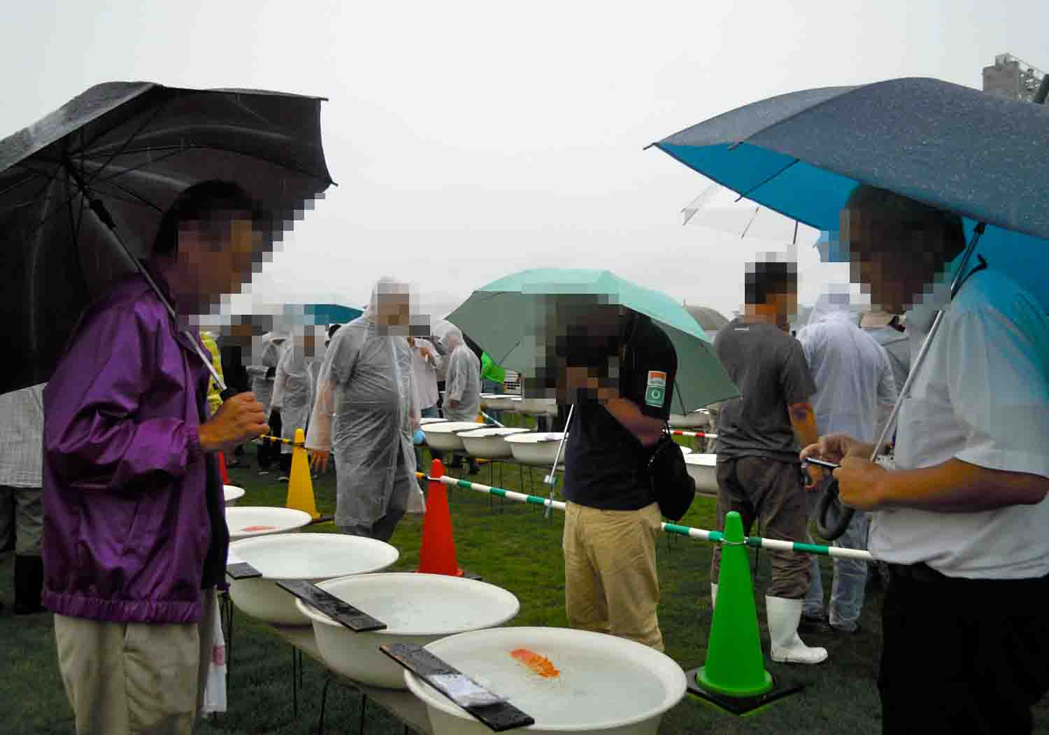 話をしていると、やっと洗面器に魚があがり会場が開放されたそうです。