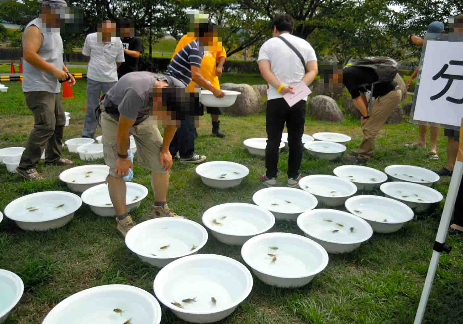 洗面器に分けられた分譲魚を買う気満々の役員さんはどの洗面器の子を、