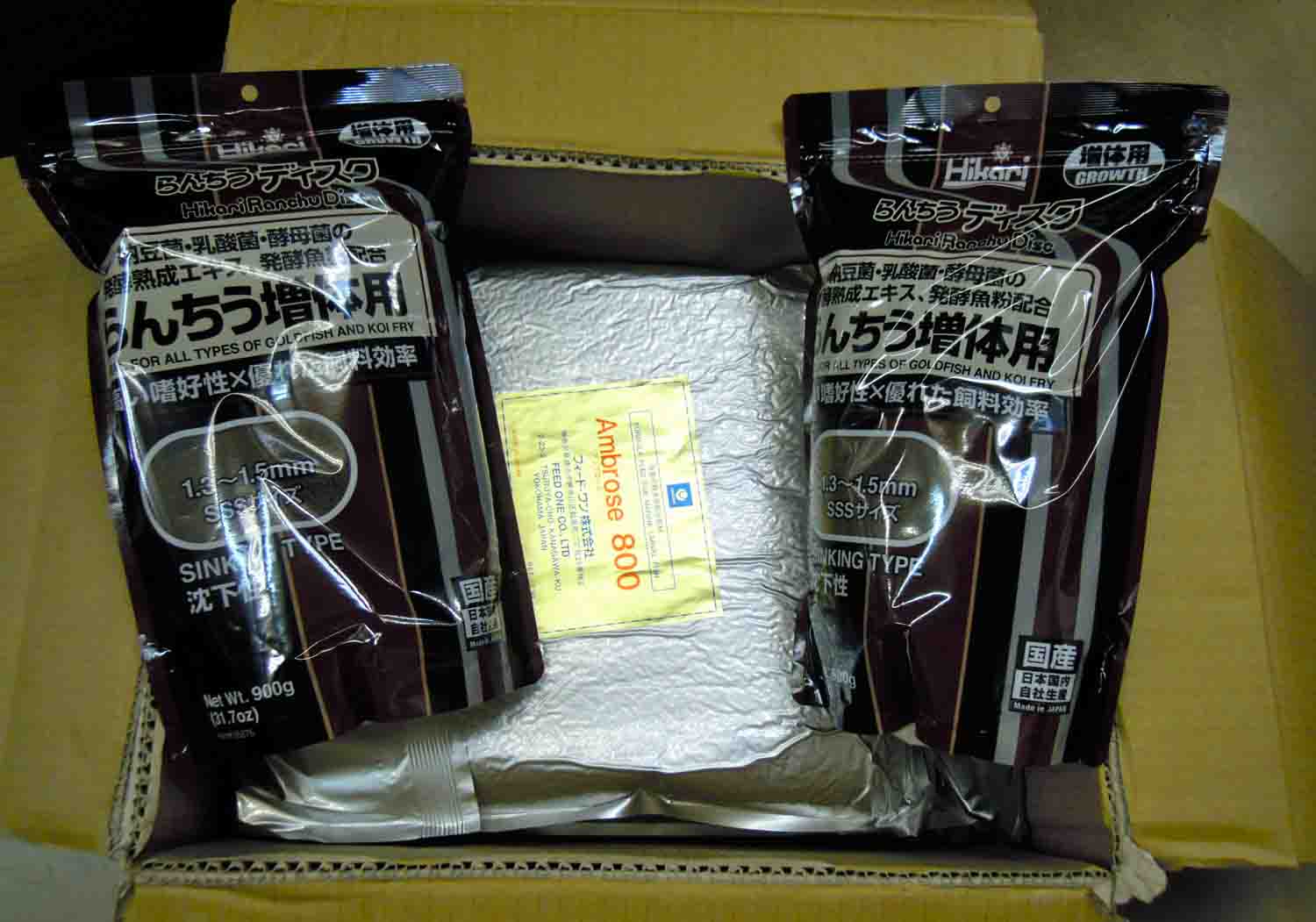 らんちうディスク900gの袋を2つとアンブローズの袋を1つを、