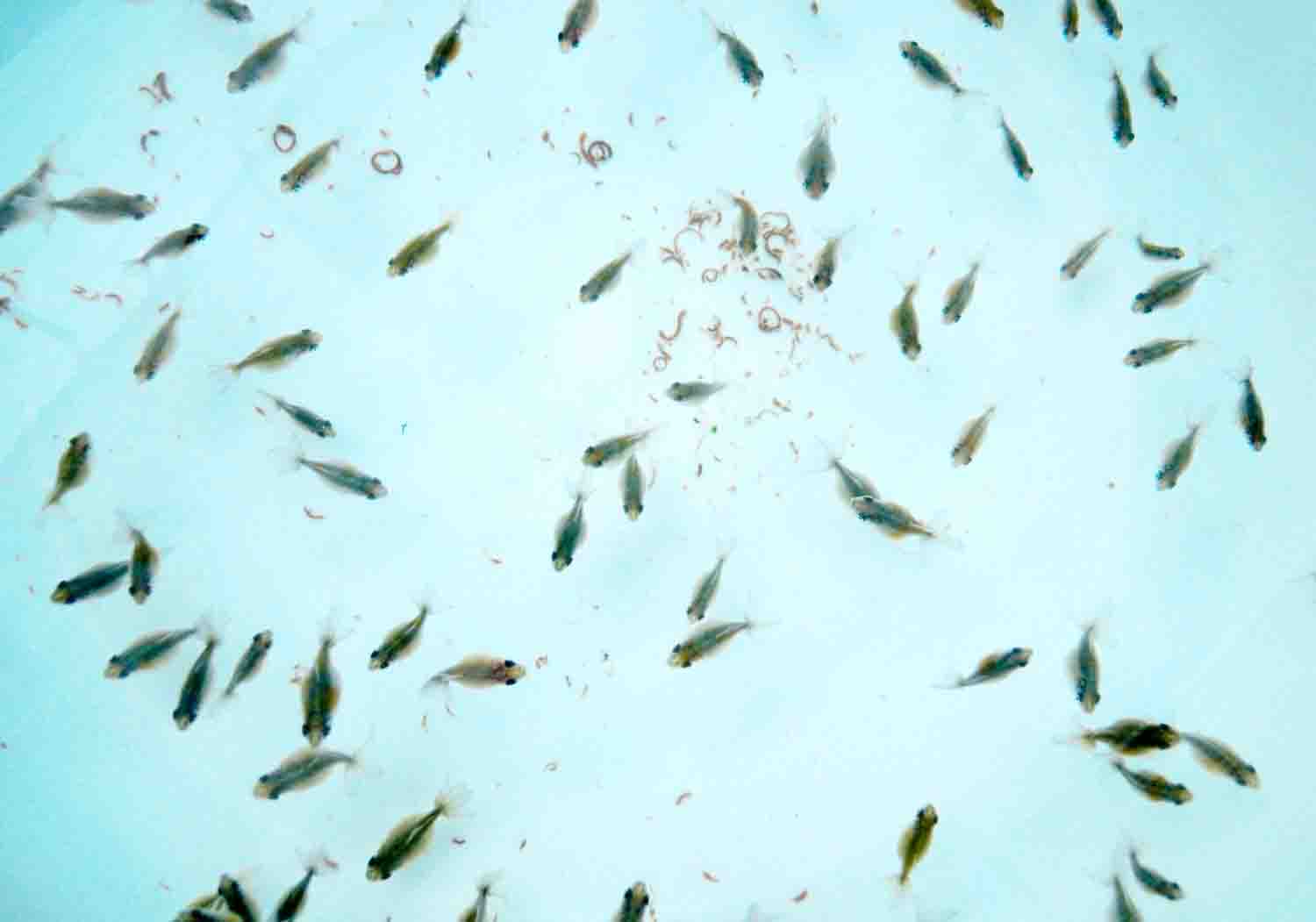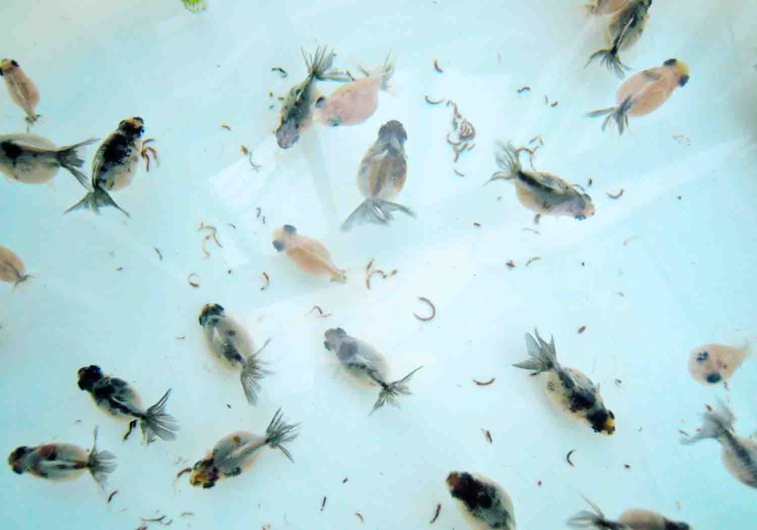 粒が柔らかいので指で潰すと口の小さな小さい稚魚は争って食べるみたいです。