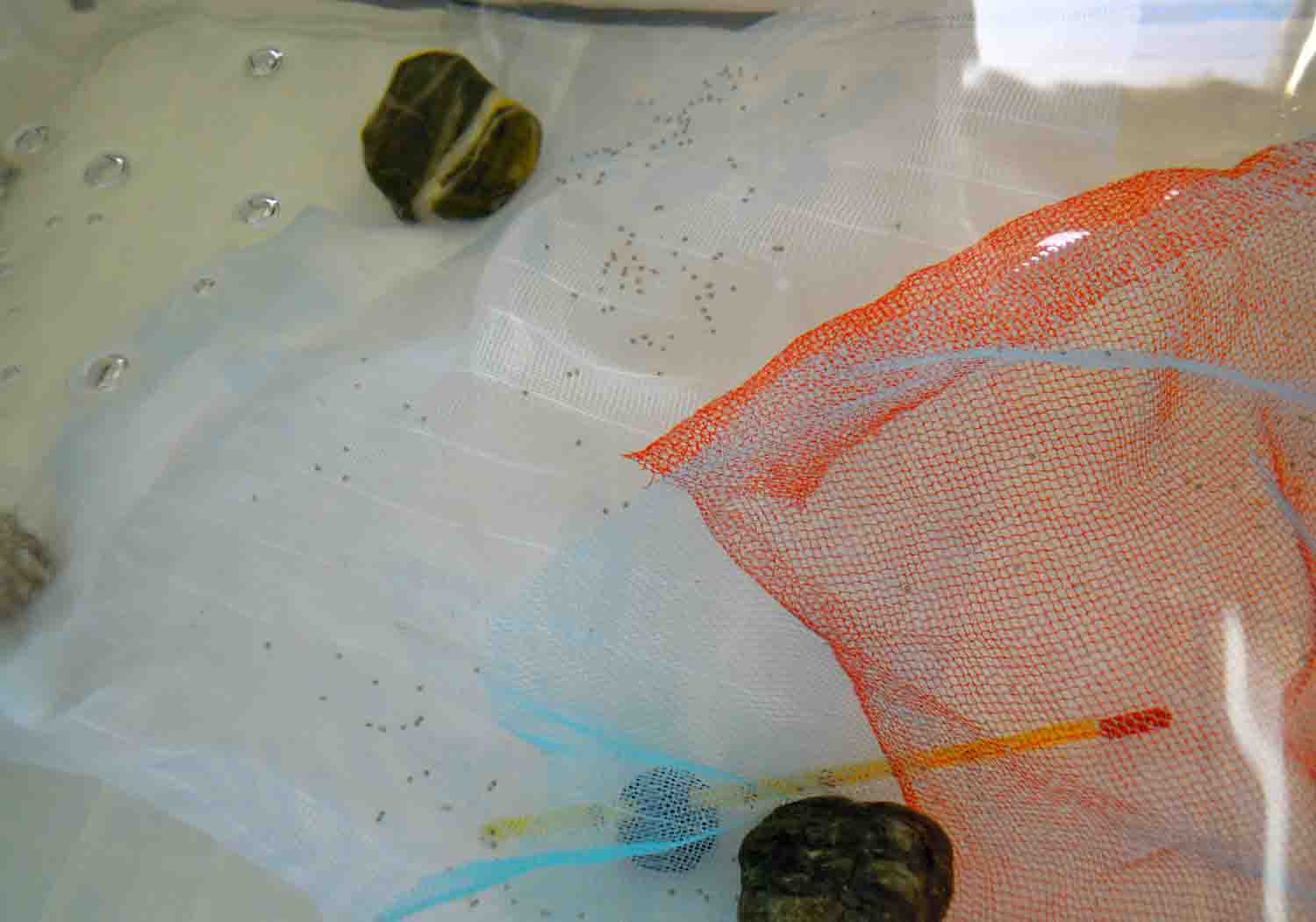 あらかた孵化したら稚魚をよけつつ卵がくっ付いていた網を