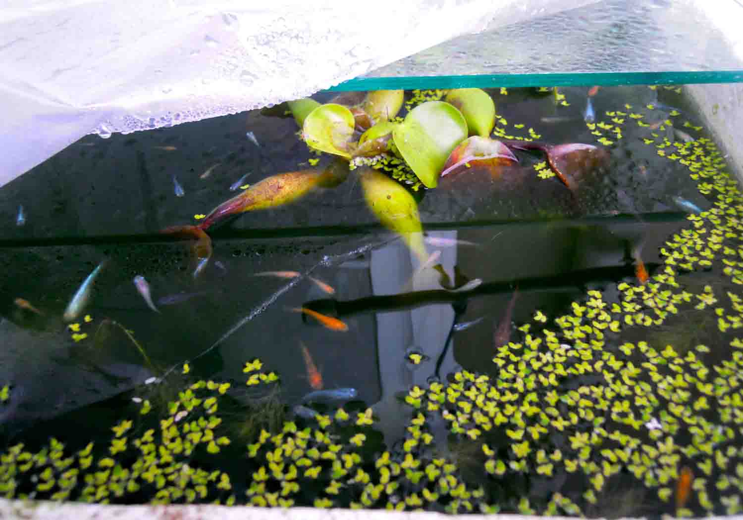 いつも話で書いている室内とは別の部屋の窓辺で浮き草を量産中です。
