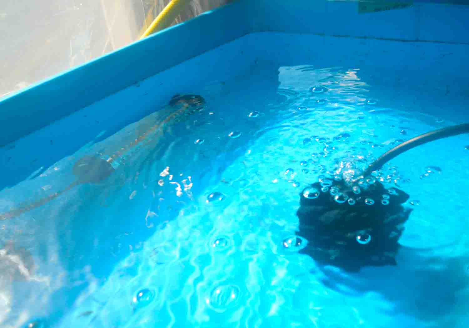 飼育水の水温が高いので稚魚を入れた洗面器を冷やさない様に湯煎をする感じで、