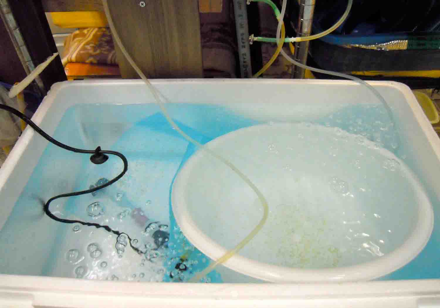 受精卵は用意してある中で一番大きい発泡スチロールに水道水を20℃にして入れました。
