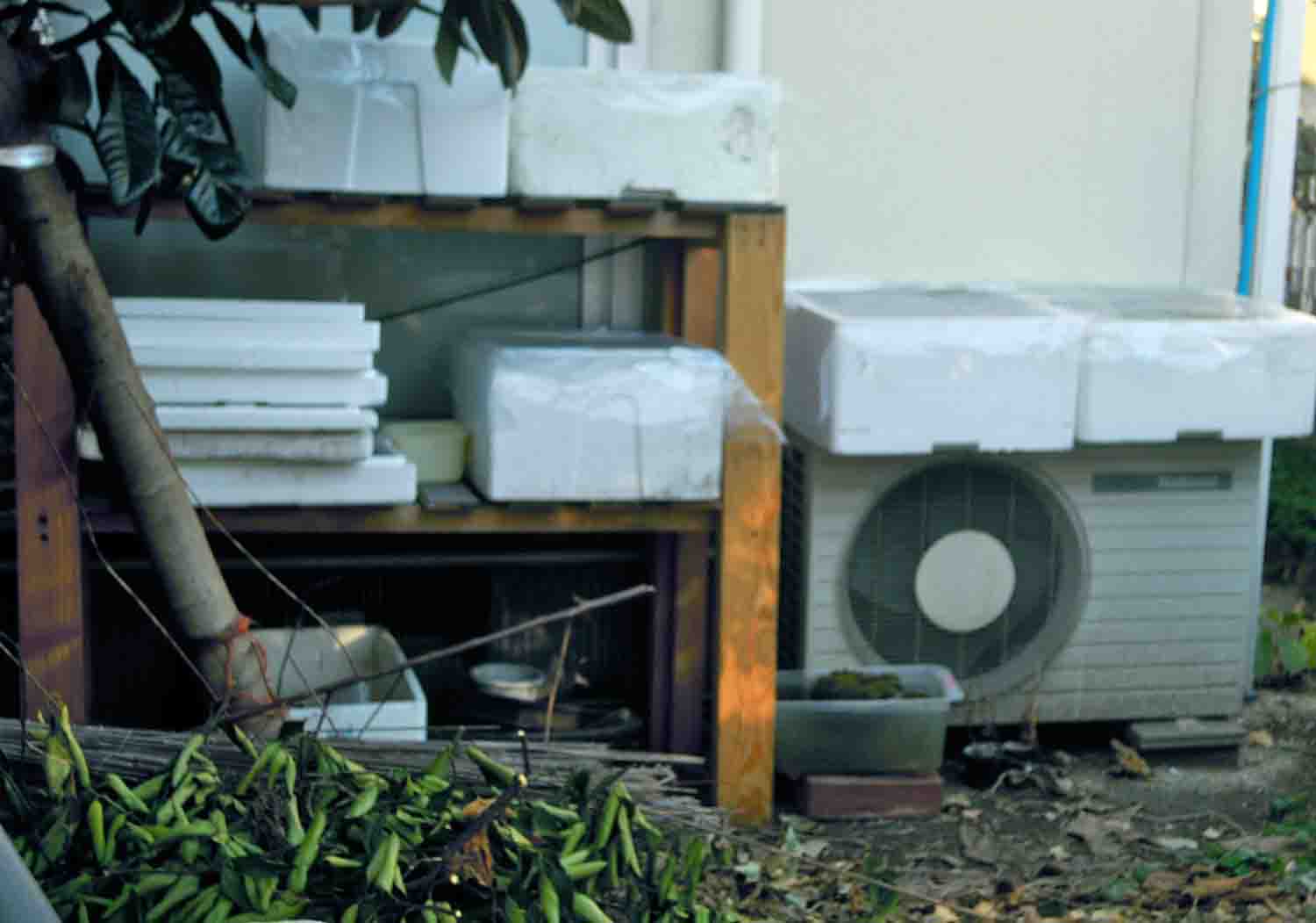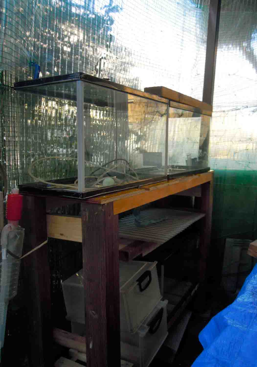 自転車置き場の棚は60cmの水槽が2つ置ける様に母が改造し、