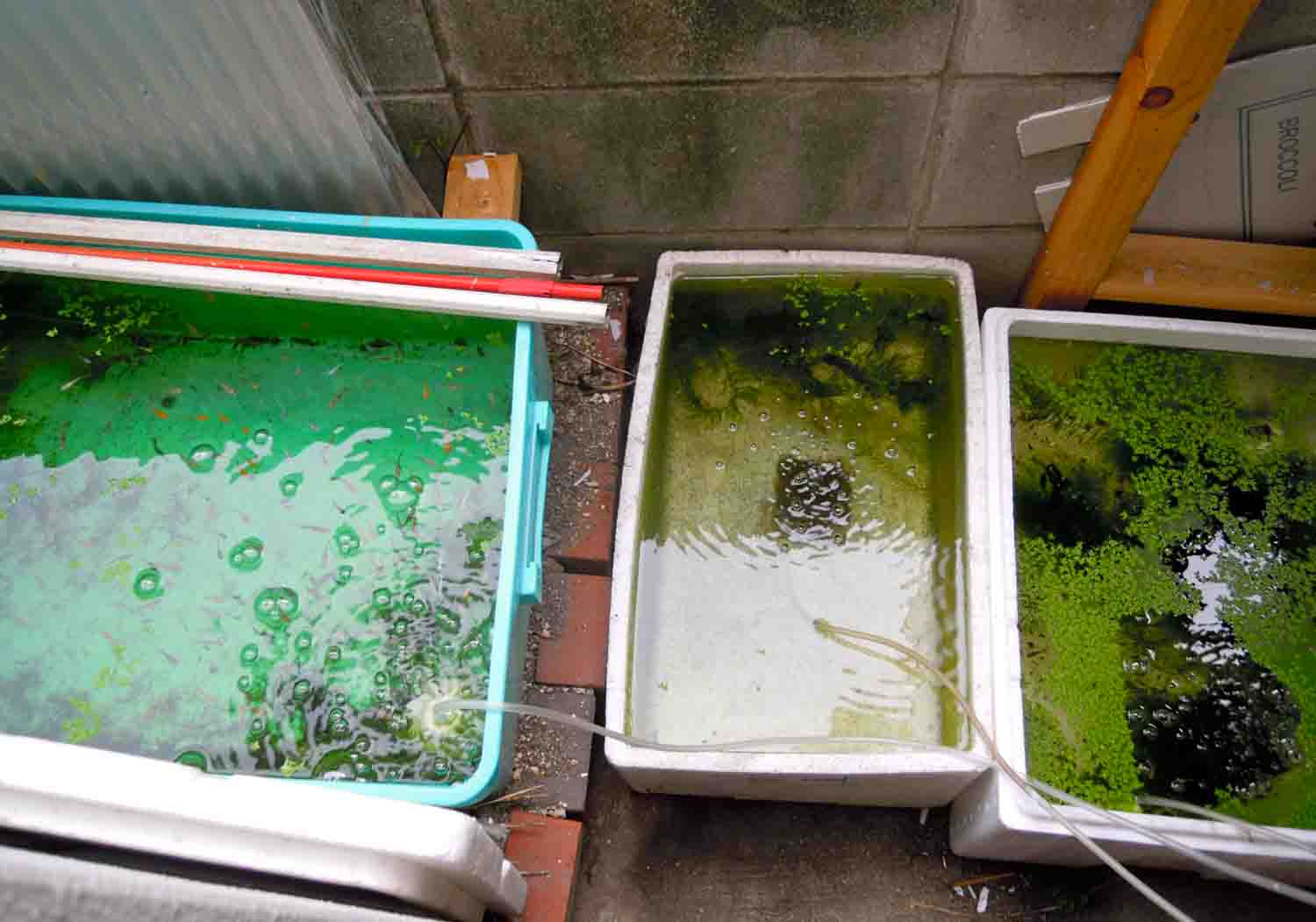 日当りが良くて良い感じに青水になっている方にもう片方の魚を移して、
