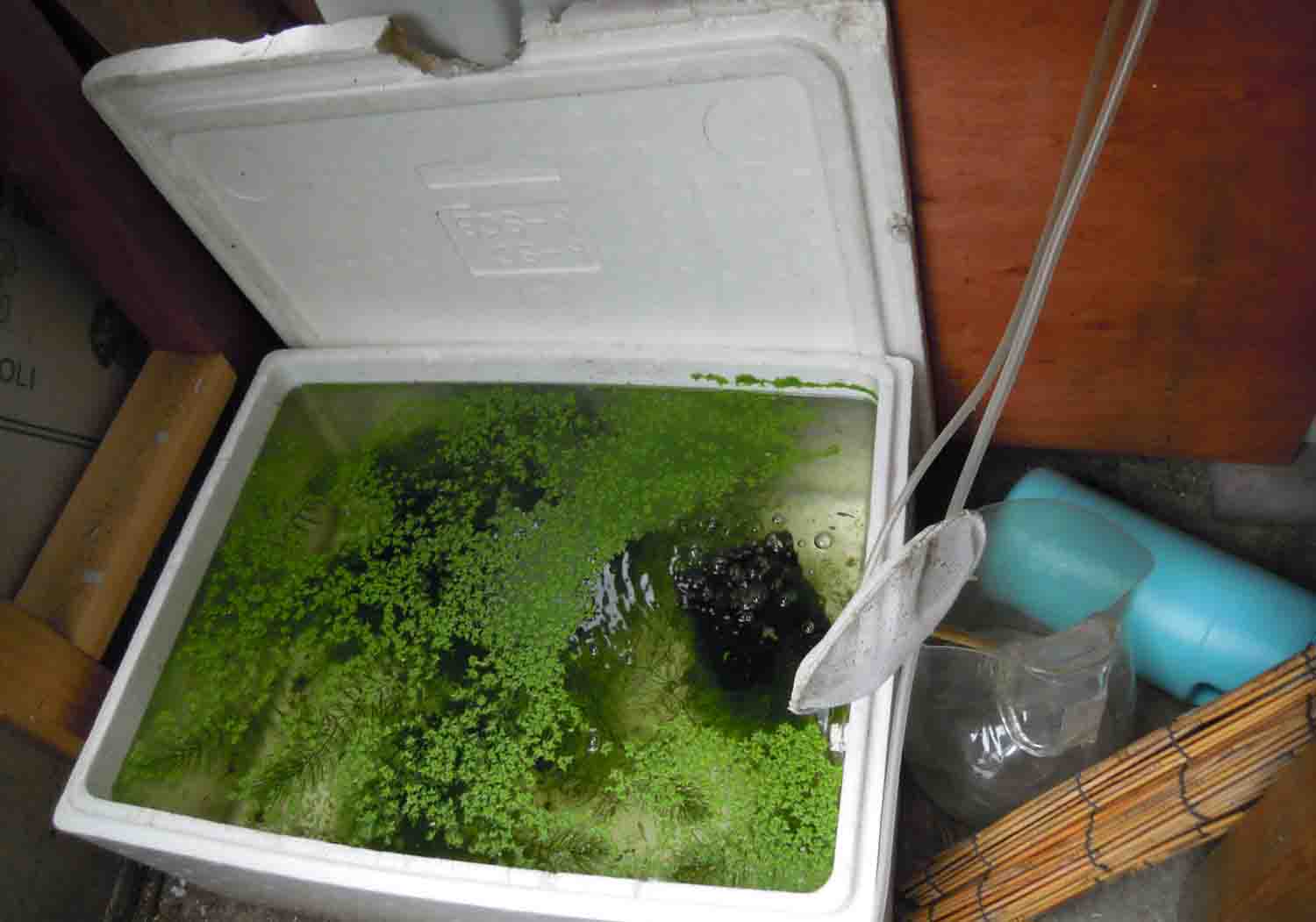 道路の端に発泡スチロールを置いてメダカと頂いたホテイアオイを育てているのですが、