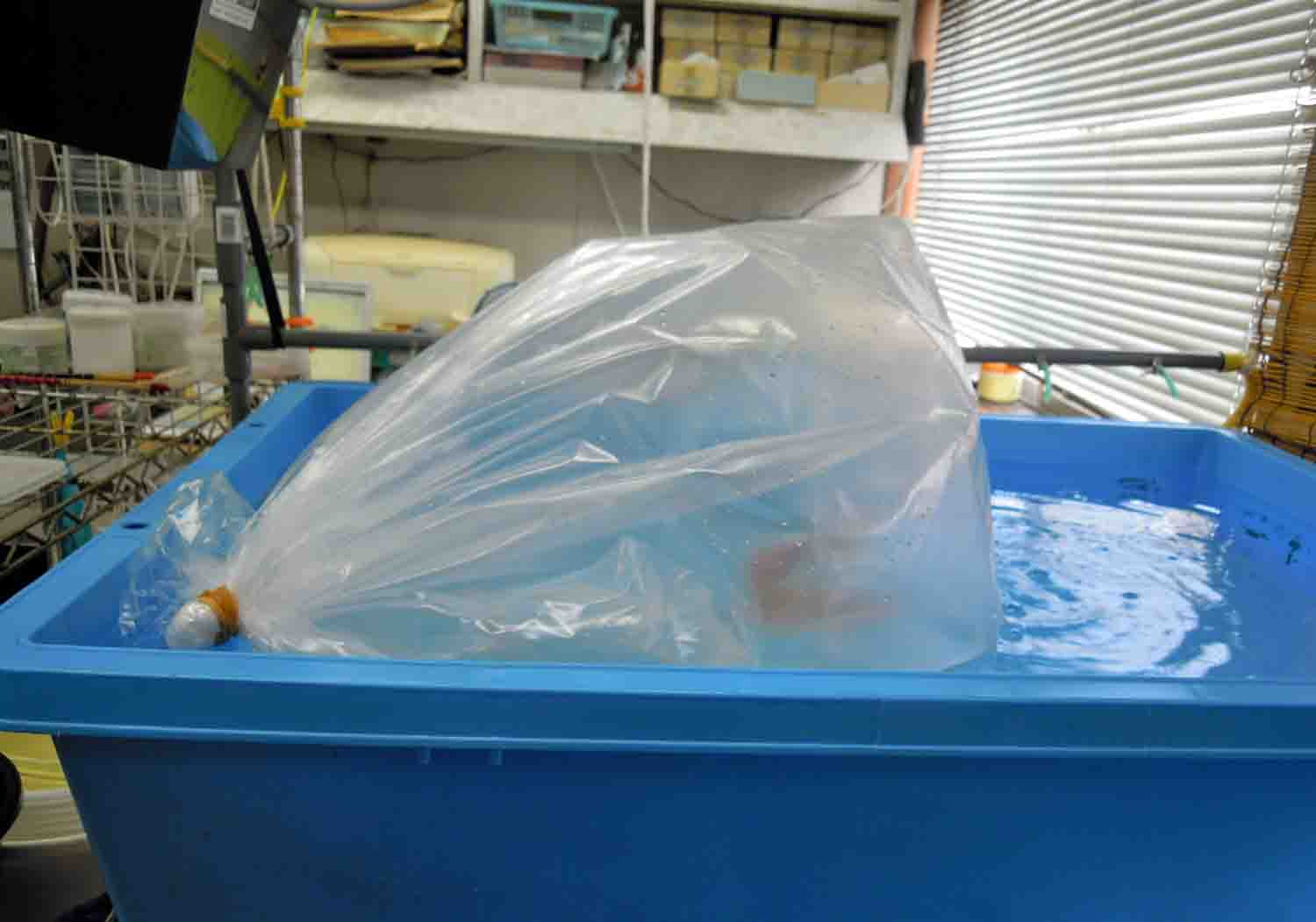 カルキ抜きを入れて水を張ってビニール袋に入った魚を浮かべました。
