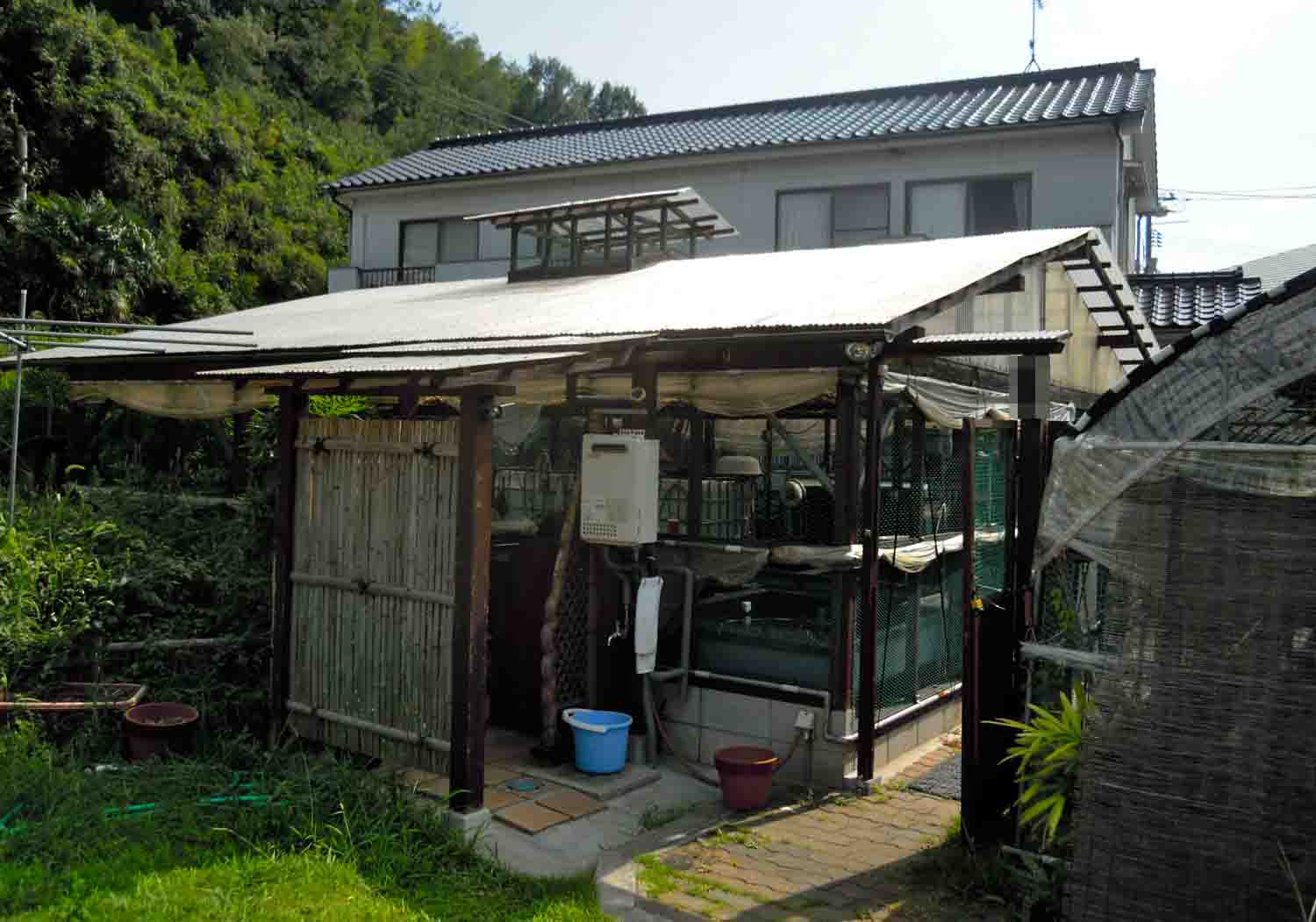 昔に使われていたビニールハウスもその中のたたき池も新しい木製の小屋も、