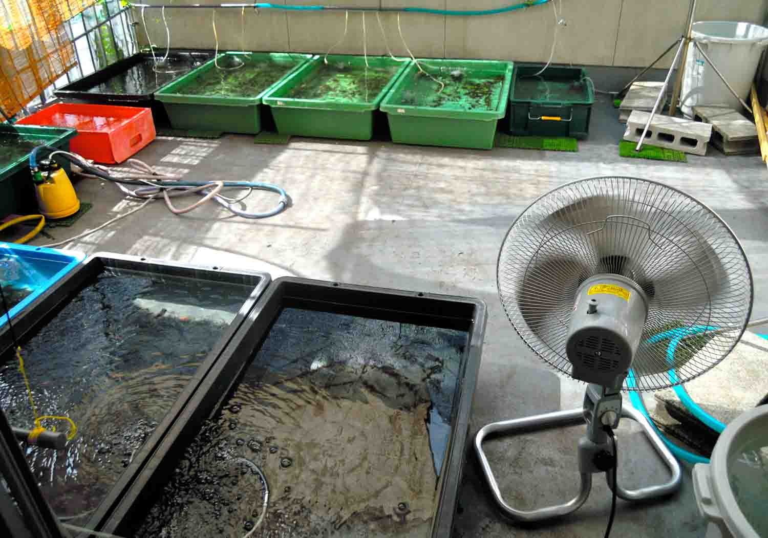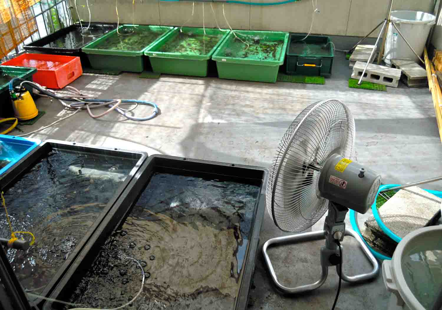 時には扇風機で風を送って水温が上がり過ぎないように気を使っています。