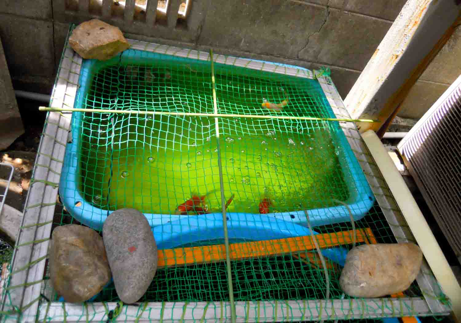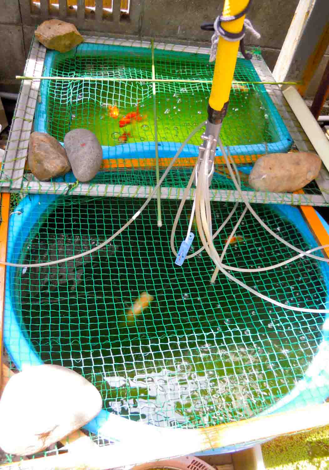 エサの回収に溜め水をしていたのを外の金魚に使っていました。