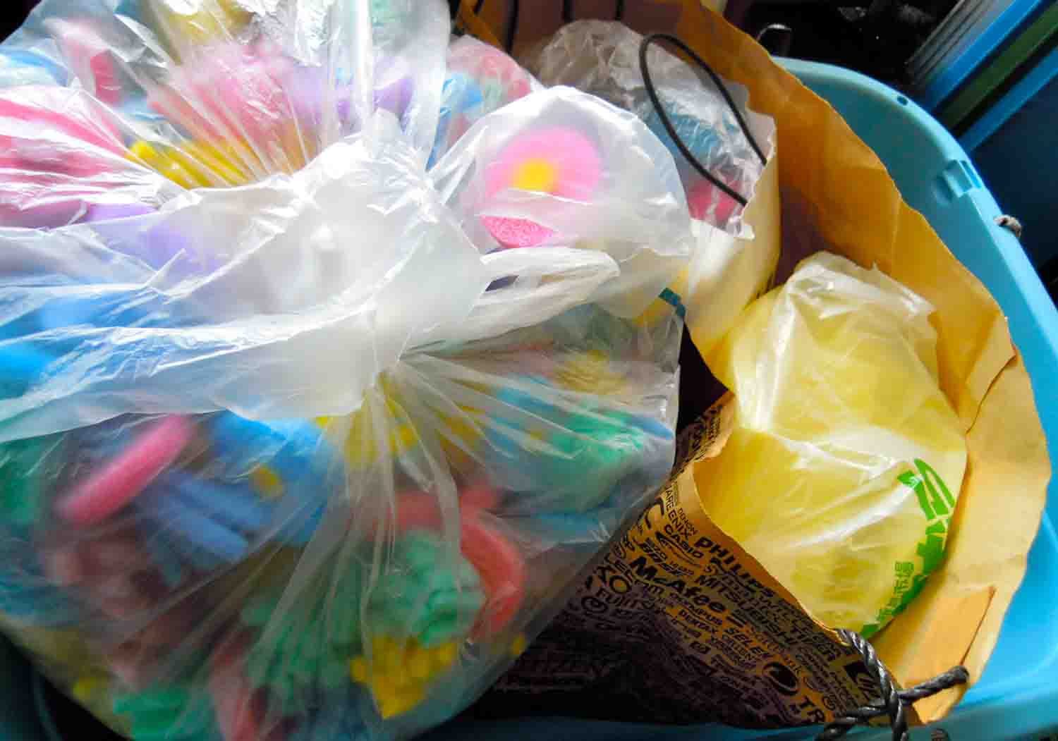 メダカを入れていた袋を1つ1つ洗って部屋に紐を張って干していきます。