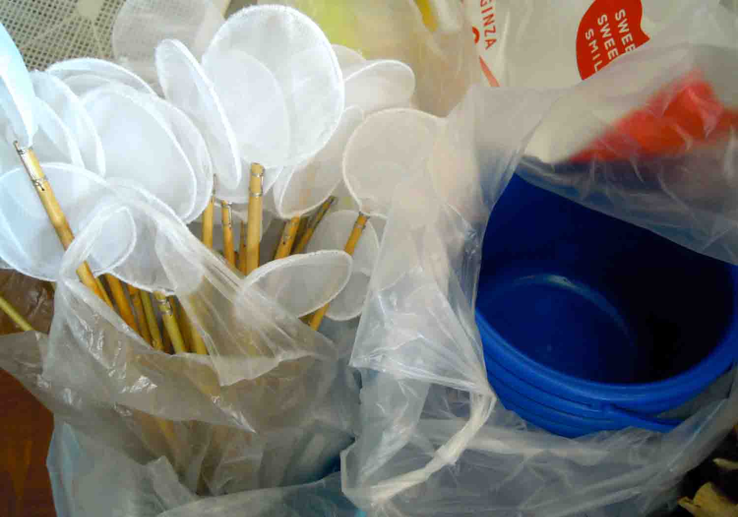 編み目をすり抜けた小さな稚魚はそのままそのいれもので育てれば良いそうです。