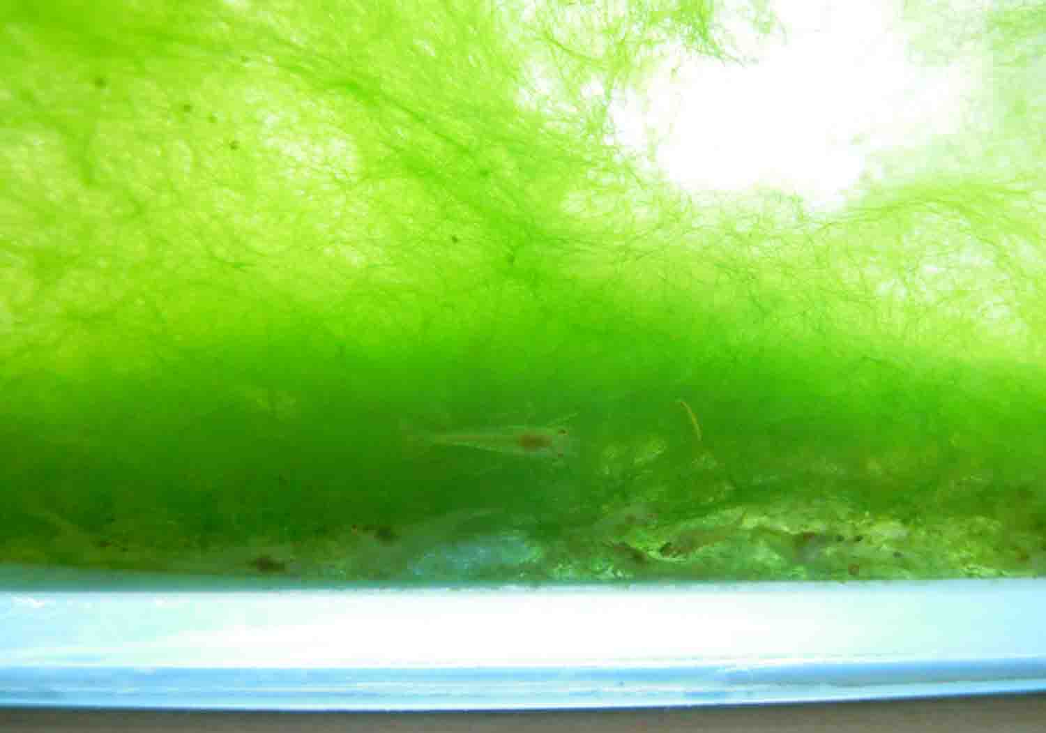 その分けた方の稚エビたちなのですがわさわさと増えたアオミドロと一緒に入れていました。