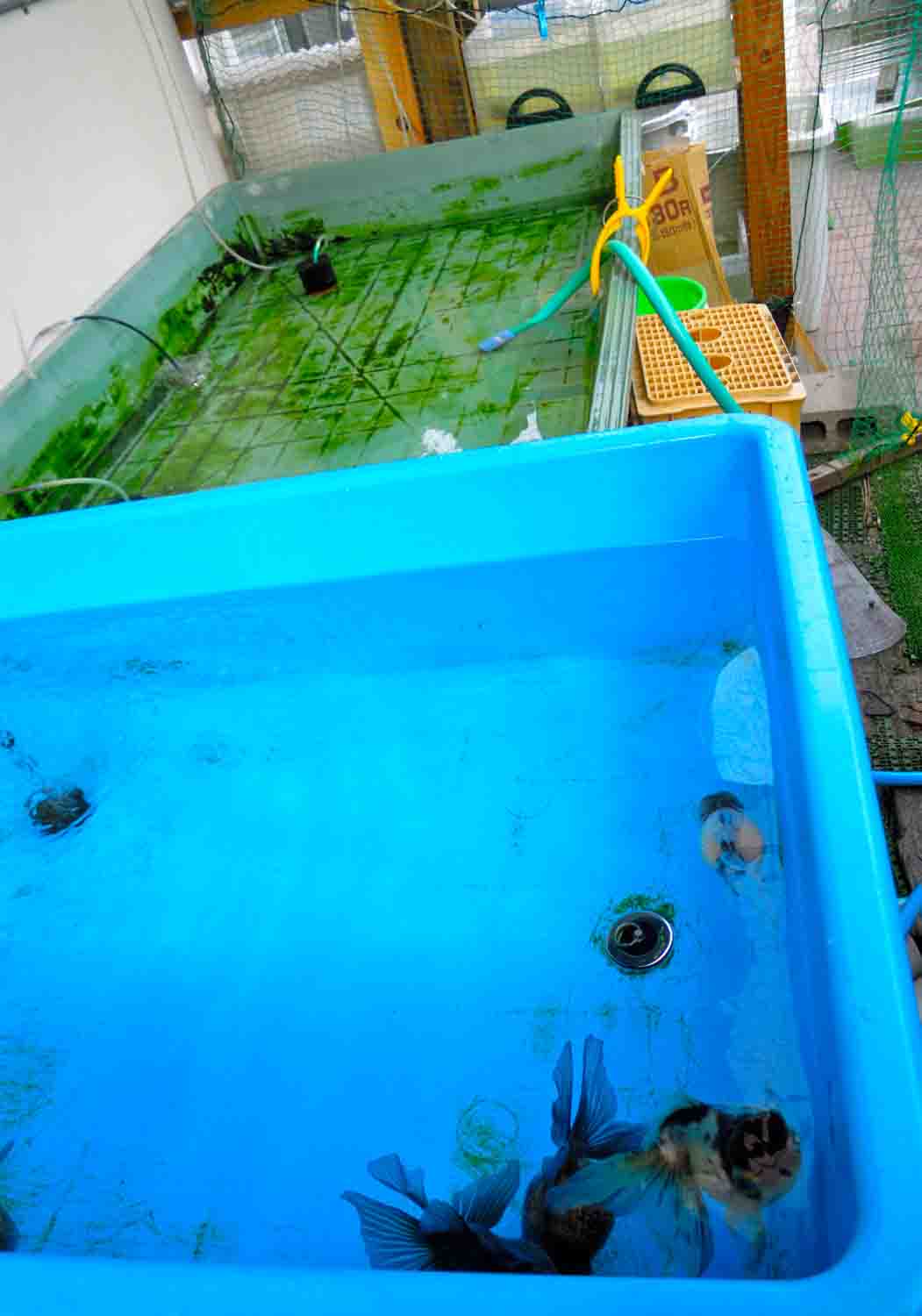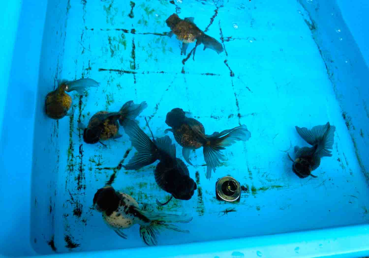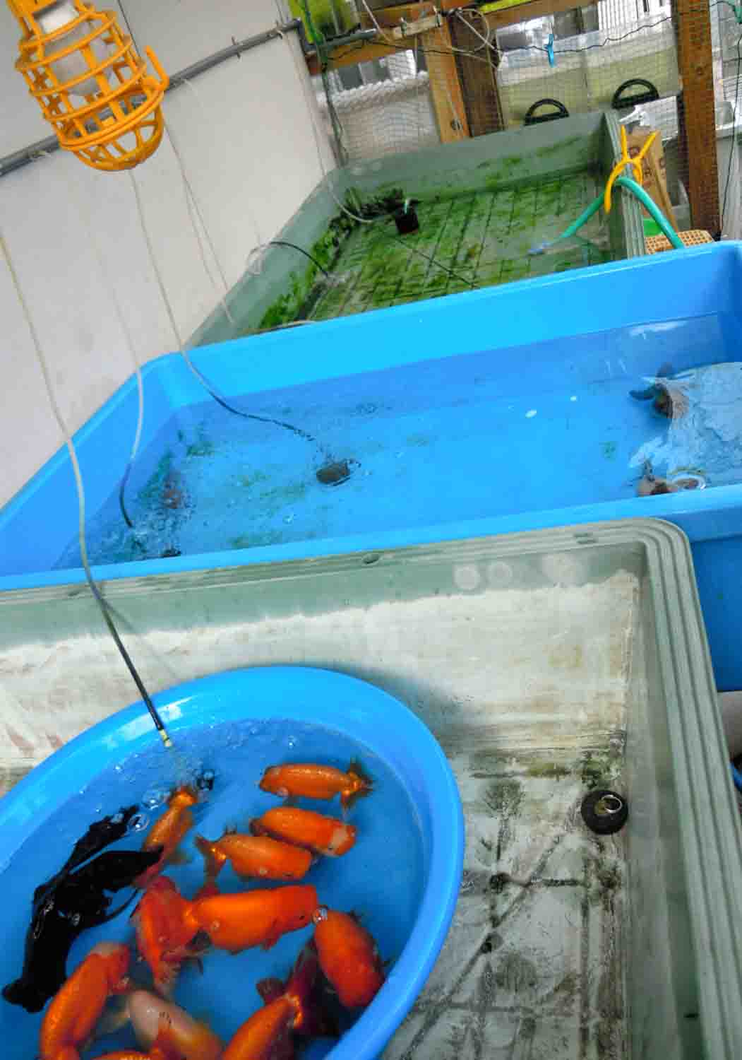自転車置き場の金魚も見てもらいながら「この子が蘭鋳、