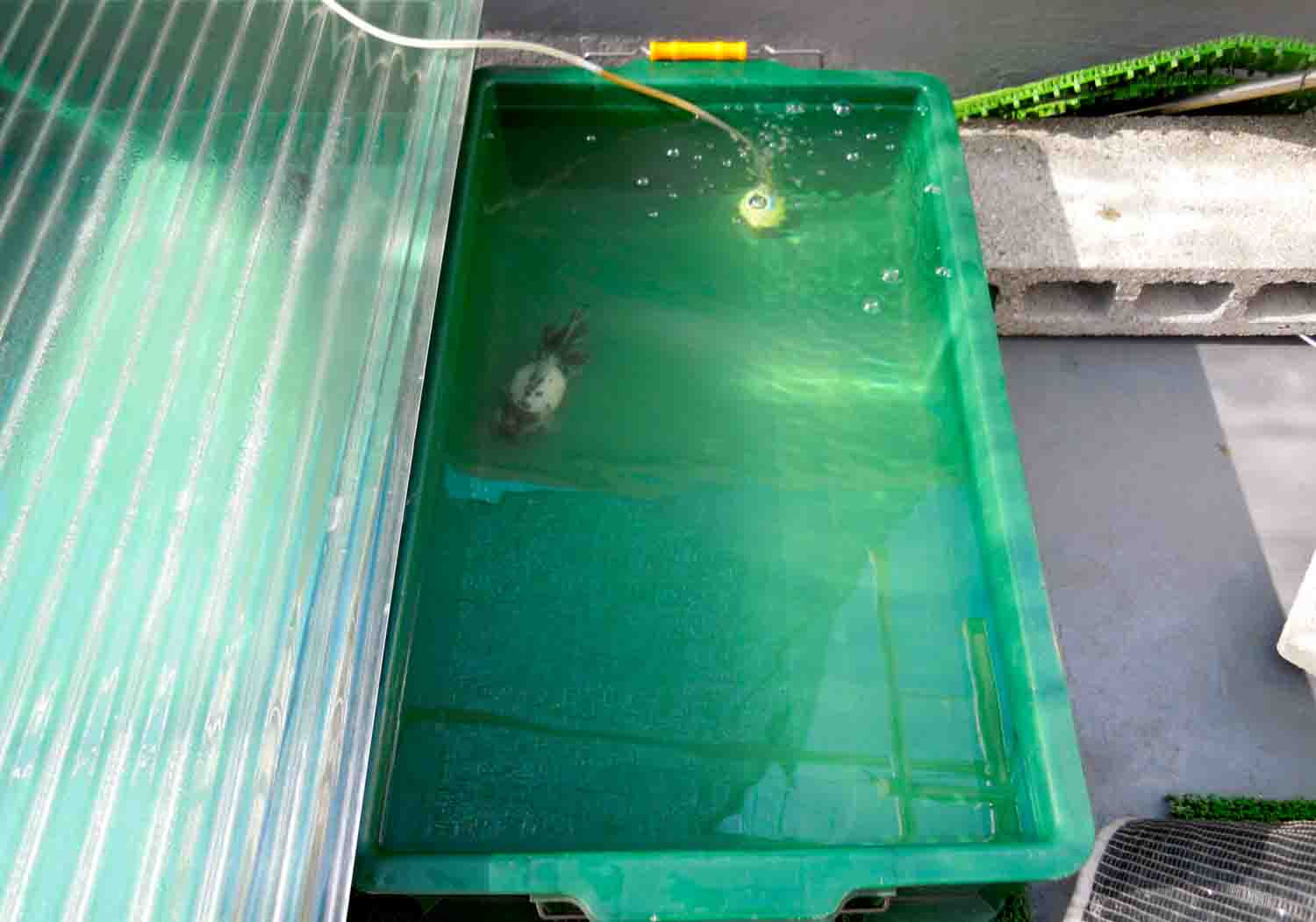 自転車置き場で60cmの水槽に薬浴中の子が3匹入っています。