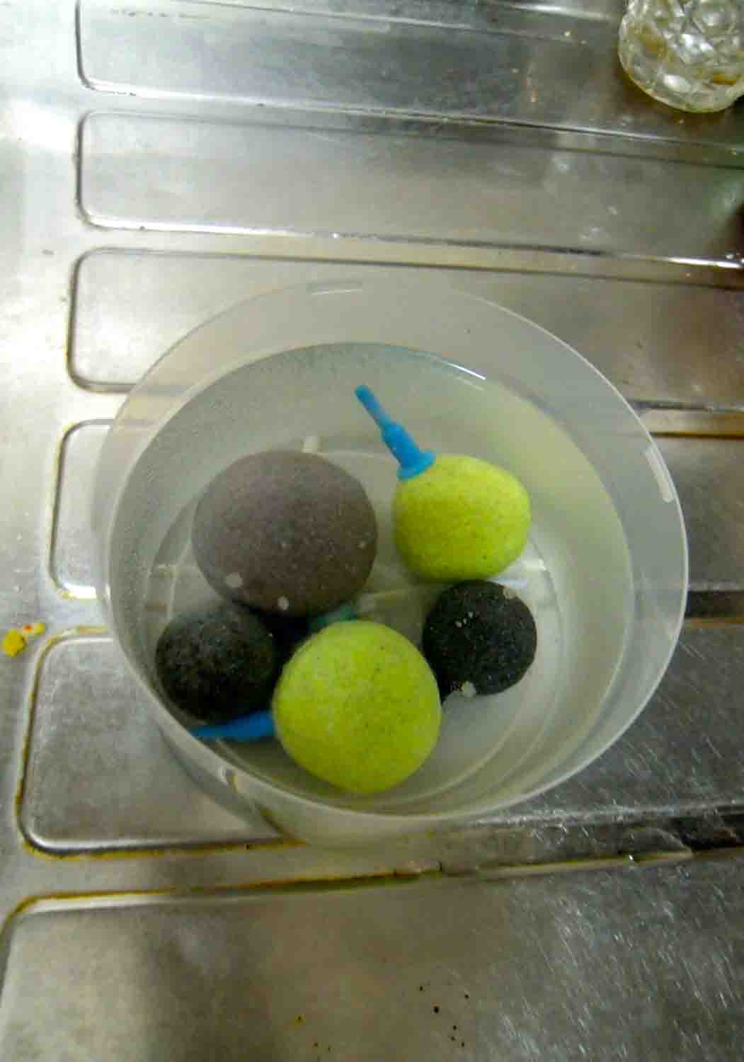 外したエアーストーンを入れ物に入れてぬるま湯を上から注いだ後、