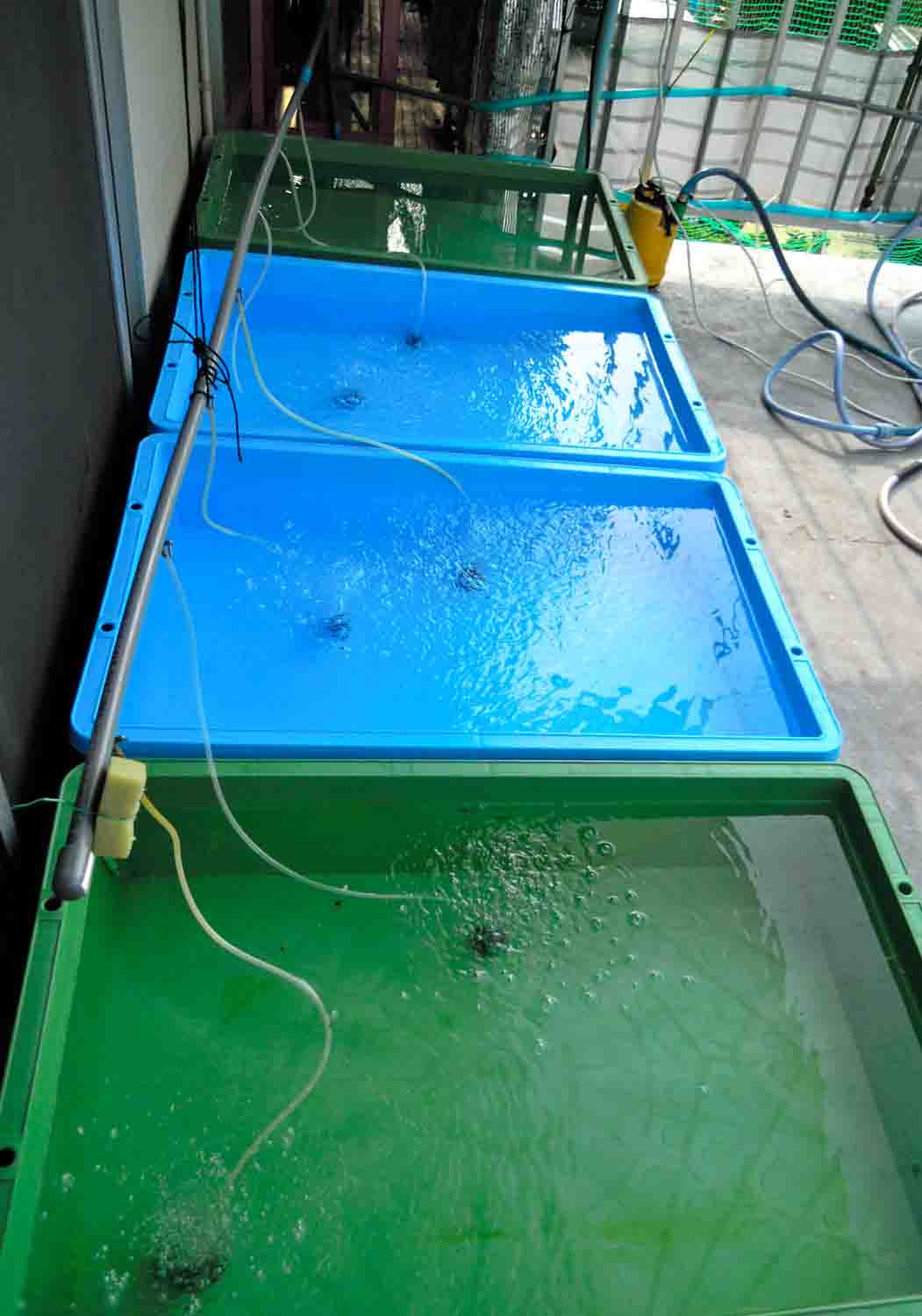 連れて帰った全体の半分の子を2つのトロ舟にざっくりと分けて入れました。