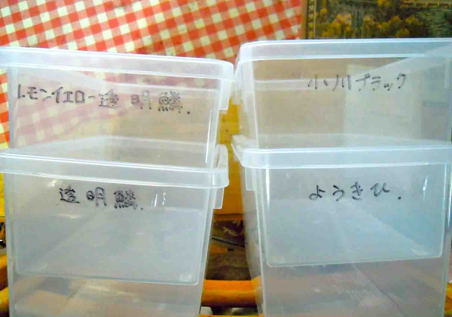分譲魚は責任者の方が公平になる様に洗面器に分けられていています。