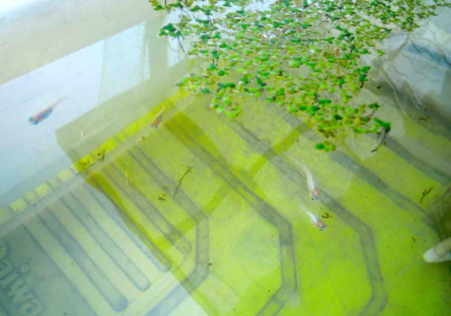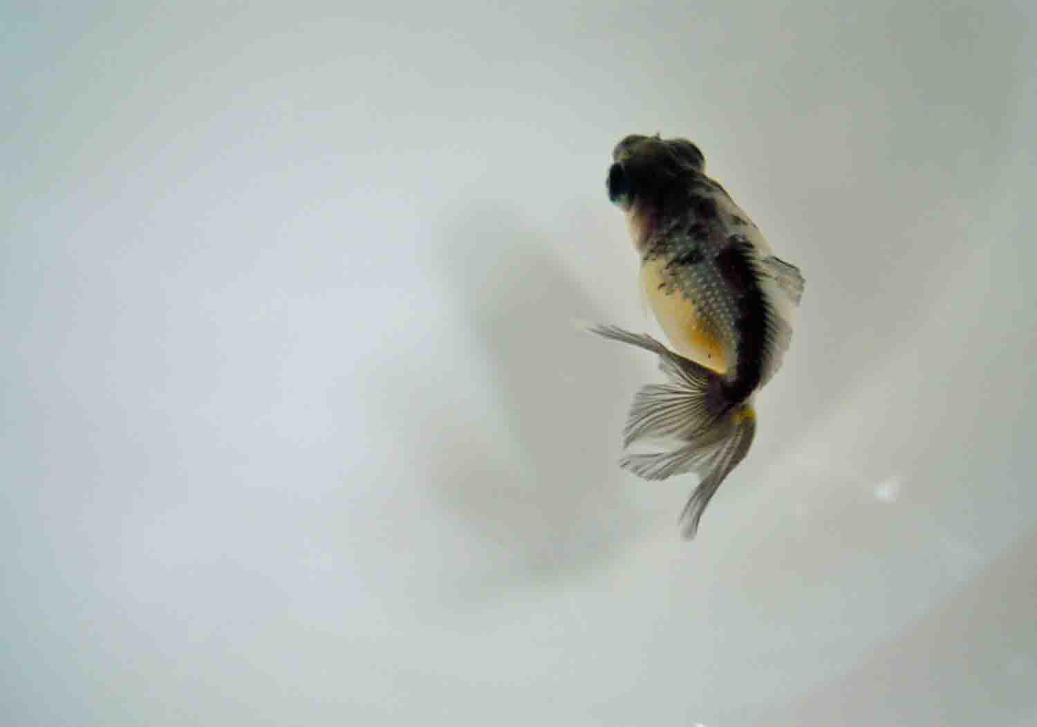 自宅のベランダに母が一番大きな稚魚を持って帰りました。