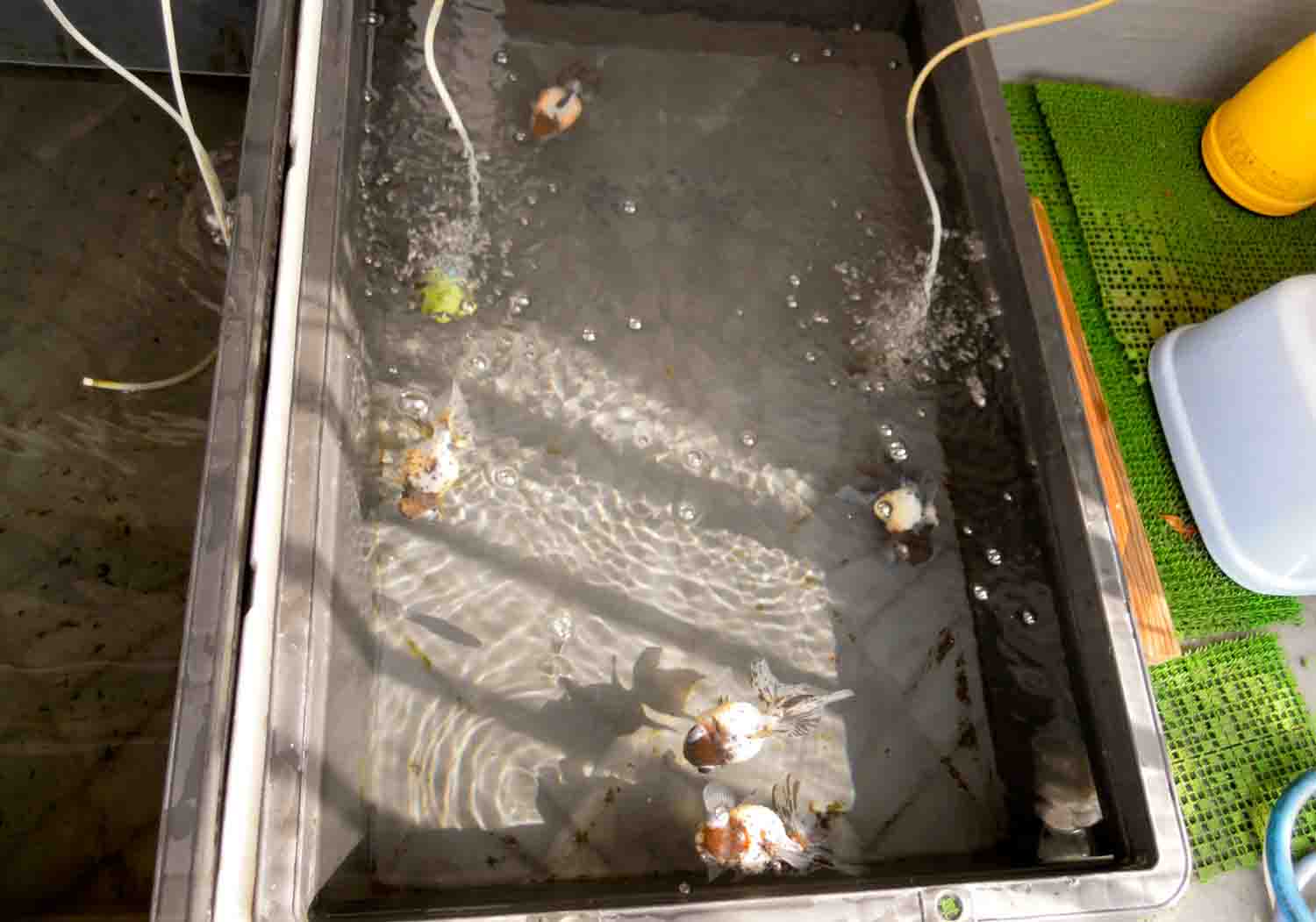 フン取りをかねて水を抜いて差し水をしていました。
