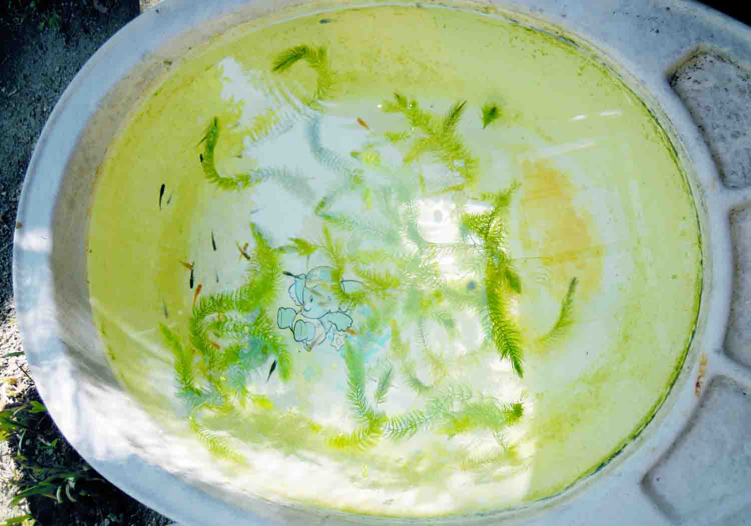 庭に置いてあるベビーバス2つのうち片方に今現在飼育している子を、