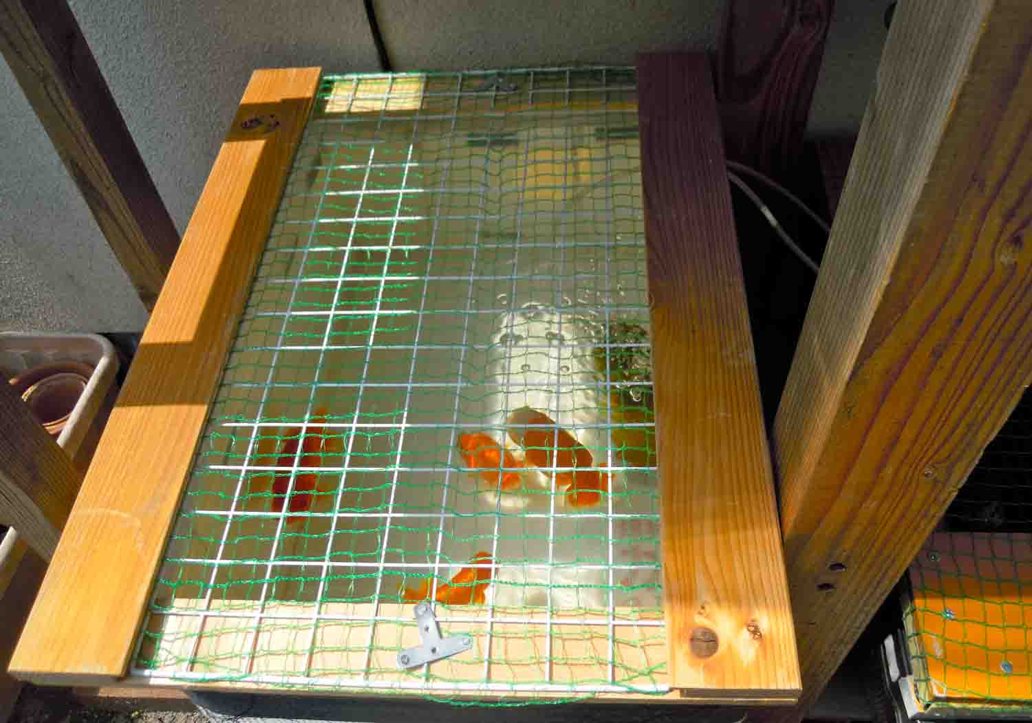 庭のトロ舟用の捕食者除けの網は木枠と金属の網だけではなく、