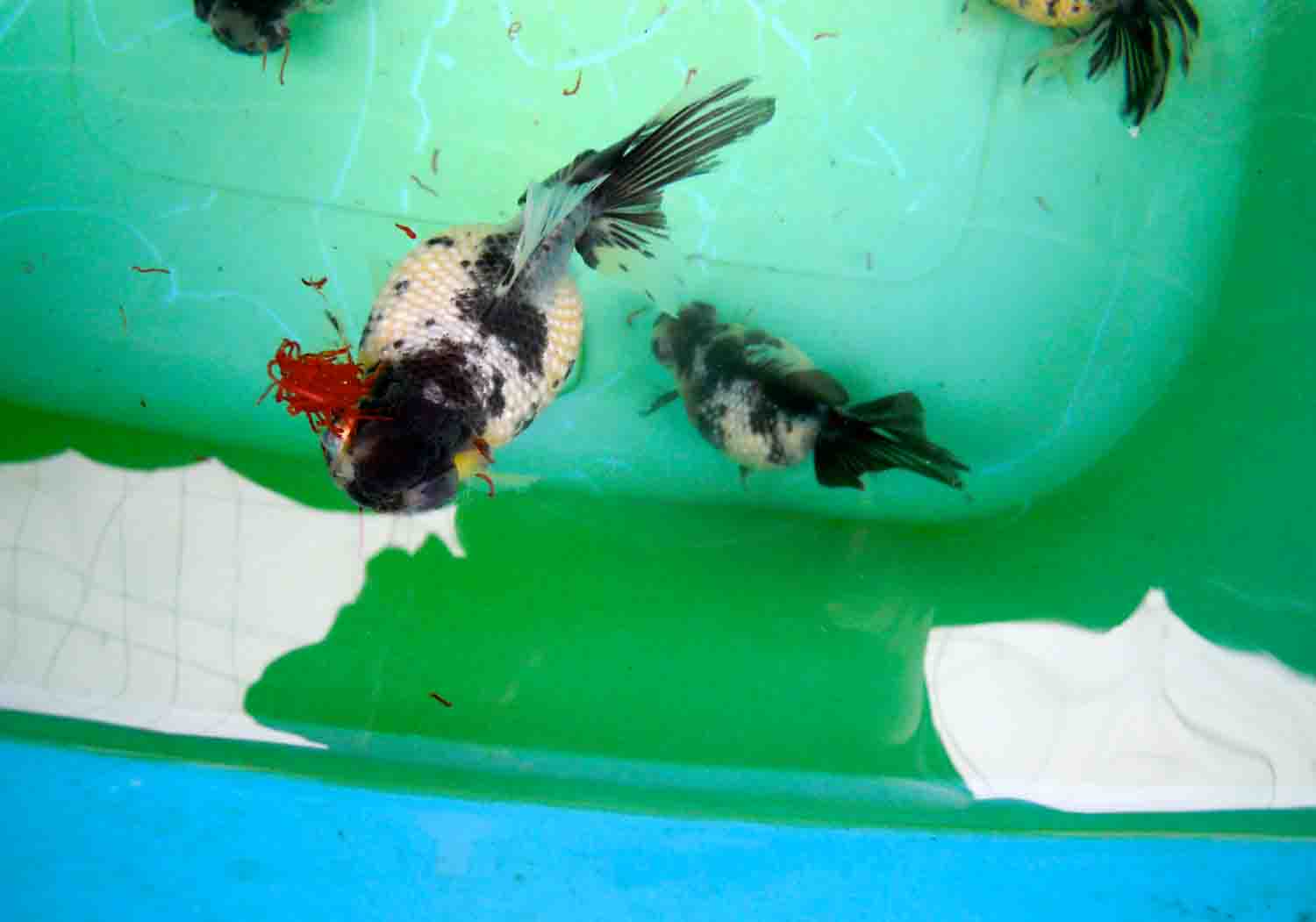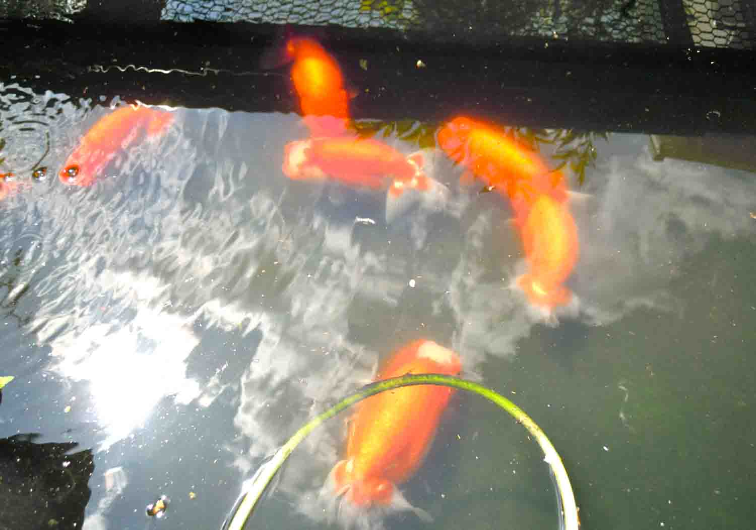 魚をすくって洗面器にとって移動させて青水をこして、
