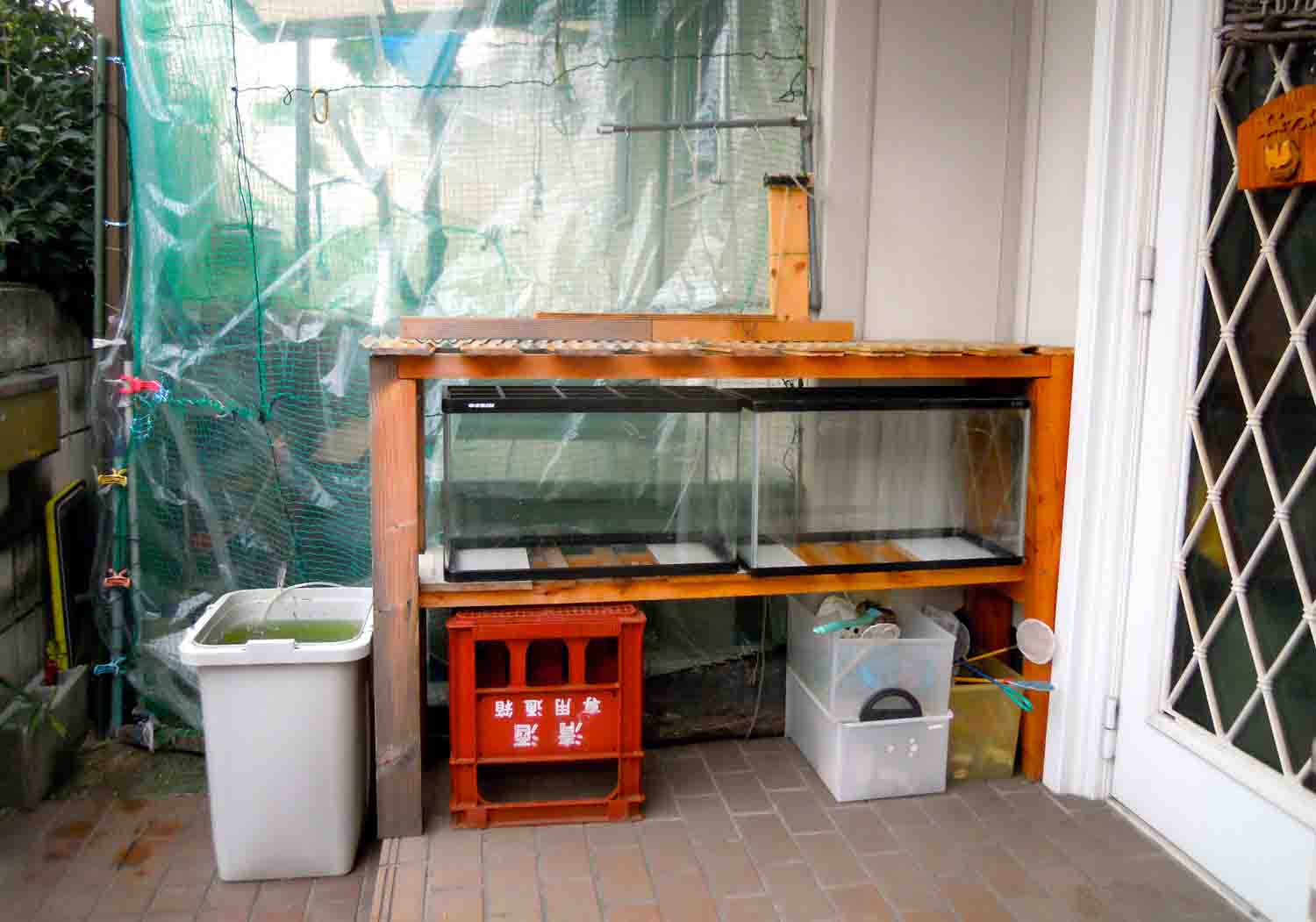 ピンポンパールや変わり竜などを自転車置き場で冬越しさせているトロ舟に、