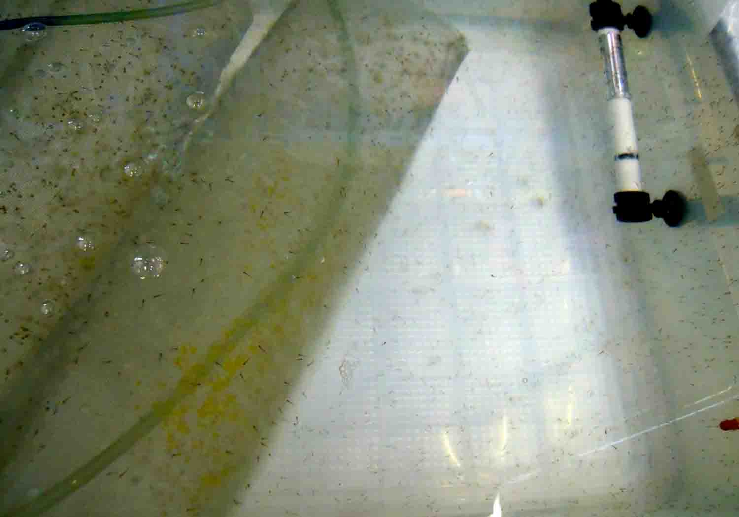 受精率が悪い網を取り出して洗いトロ舟に残るカビた卵を、