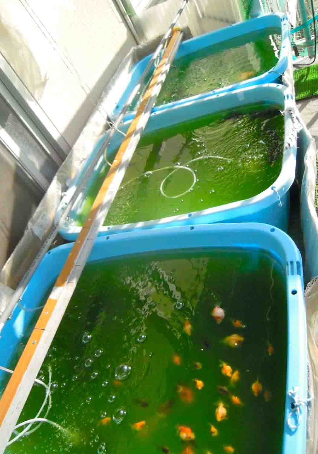 空いた北側の自転車置き場には早目に採卵したい蘭鋳とハネ魚の