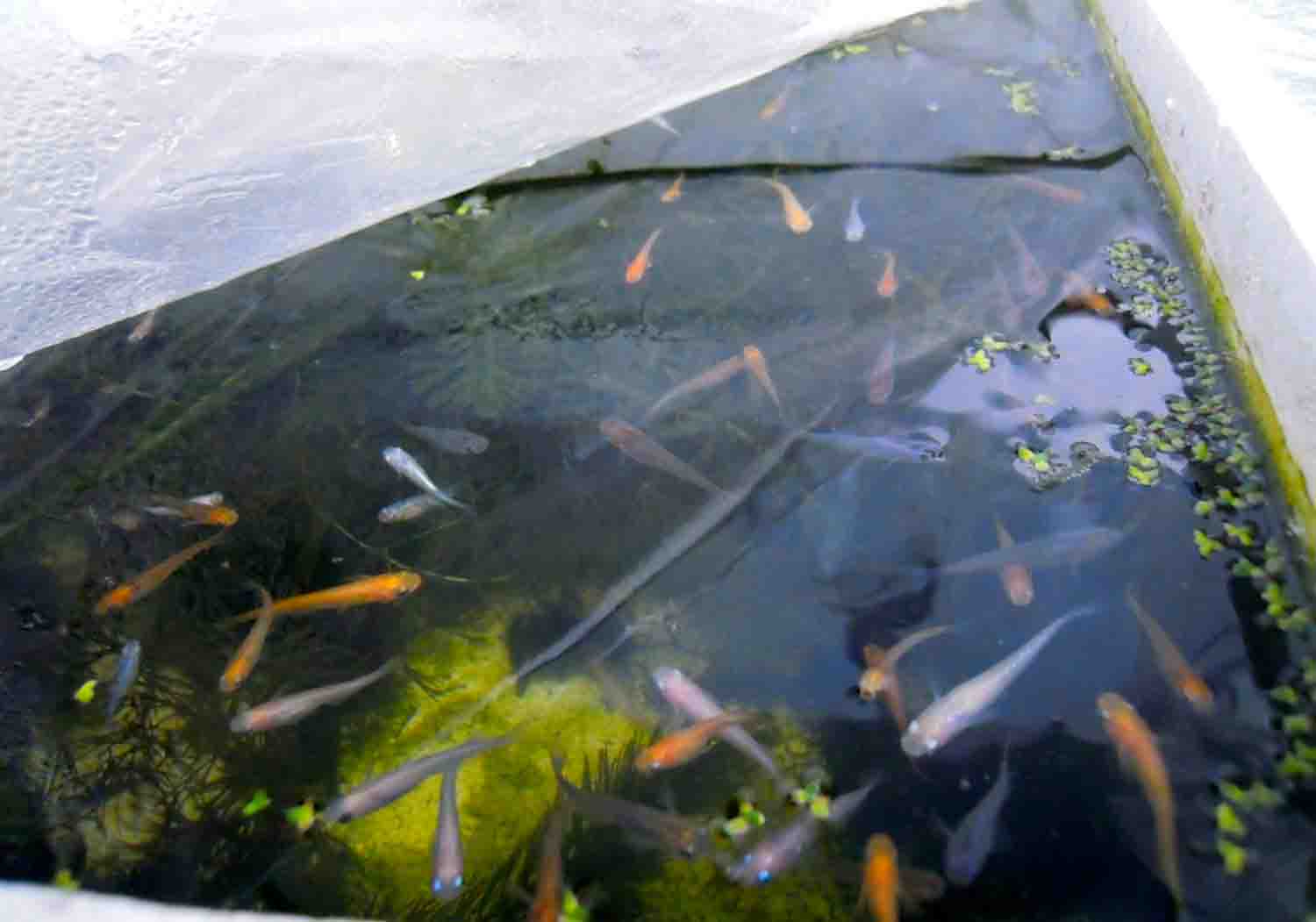 小さい子やダルマメダカも元気にエサを求めて寄ってくるので、
