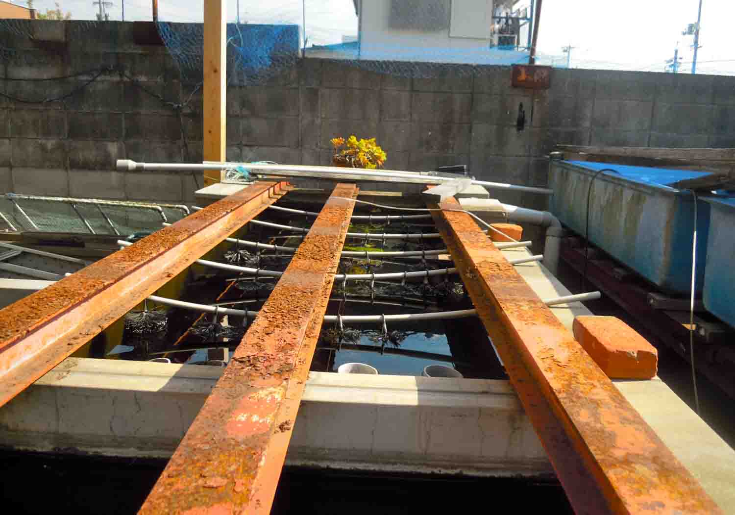 水の無くなったたたき池が多くなり大将が使っていたトロ舟や手作りフィルターなど、