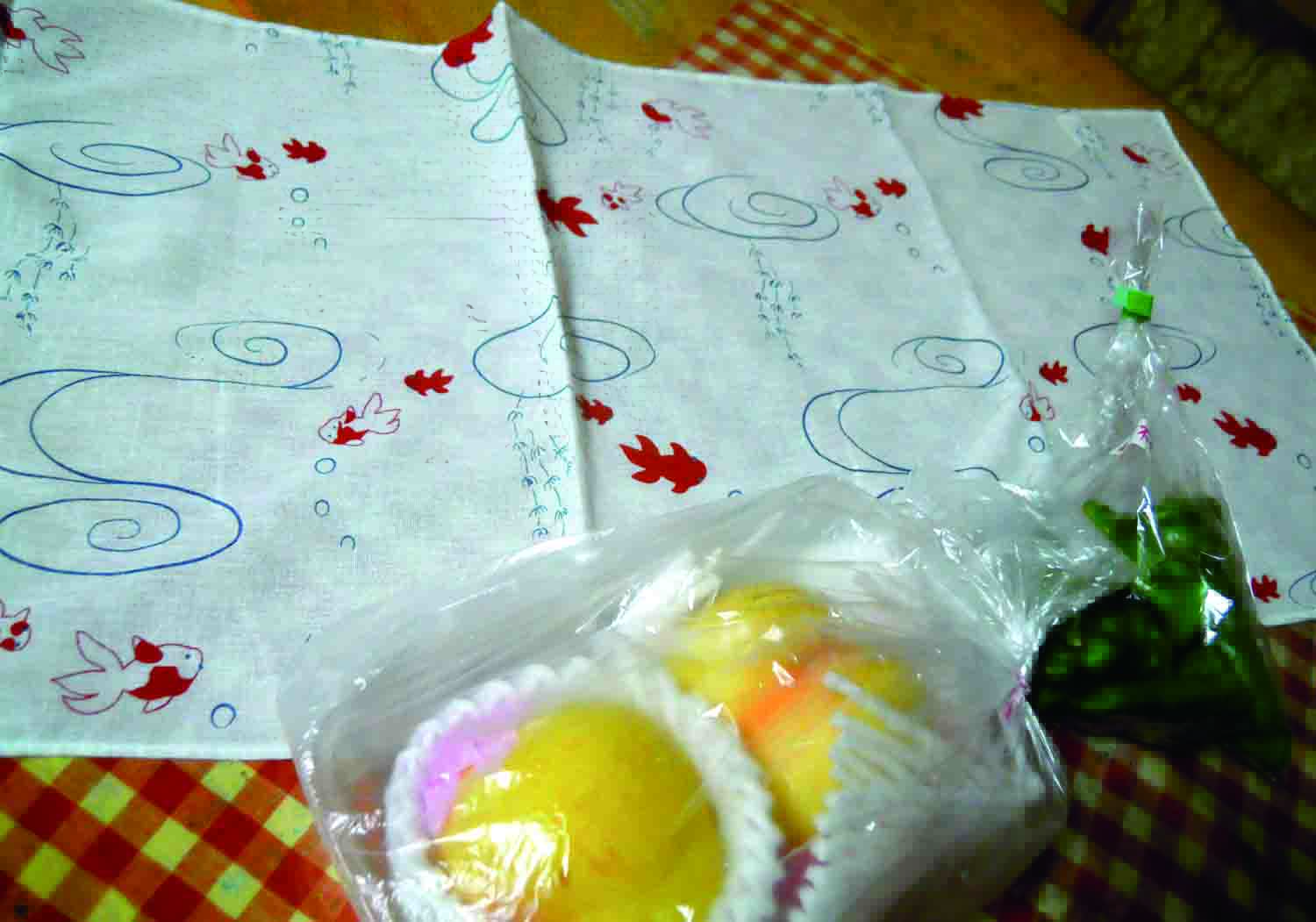 母の大好きな白桃と新鮮なピーマンと金魚柄の可愛い手ぬぐいを頂きました。