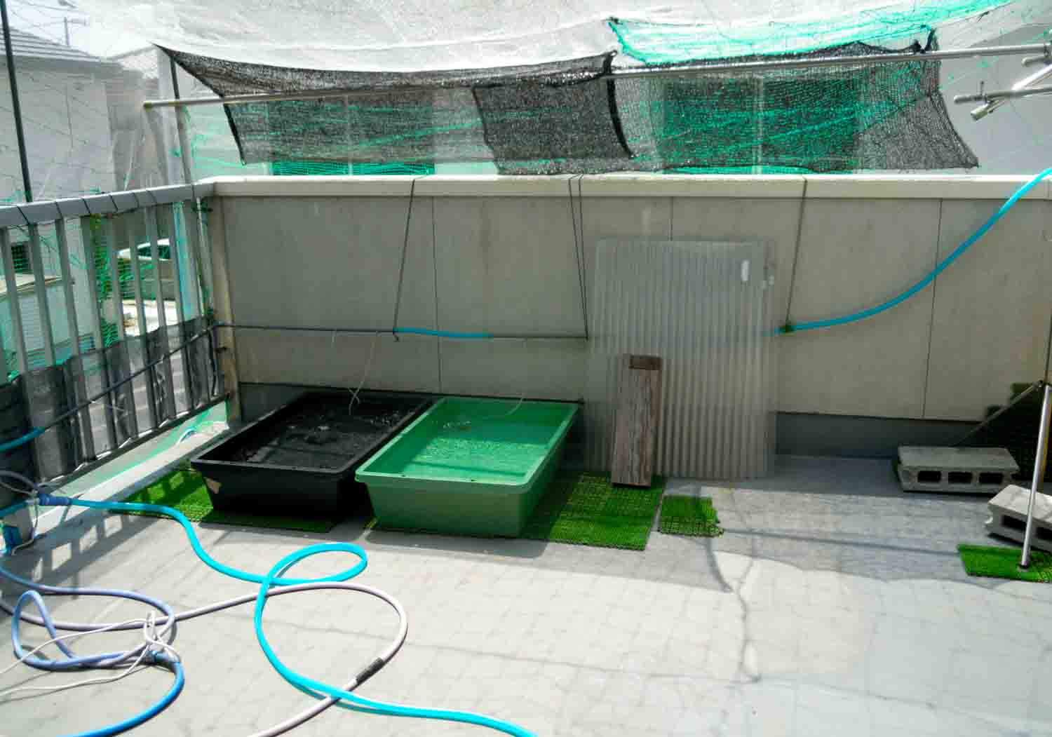 自転車置き場で60cmの水槽に薬浴中の子が3匹入っています。
