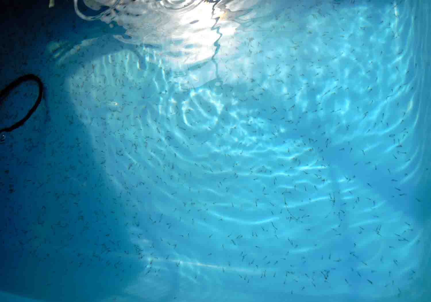 水槽の底に蘭鋳達に食べられずに少し残った300個くらいの卵が、