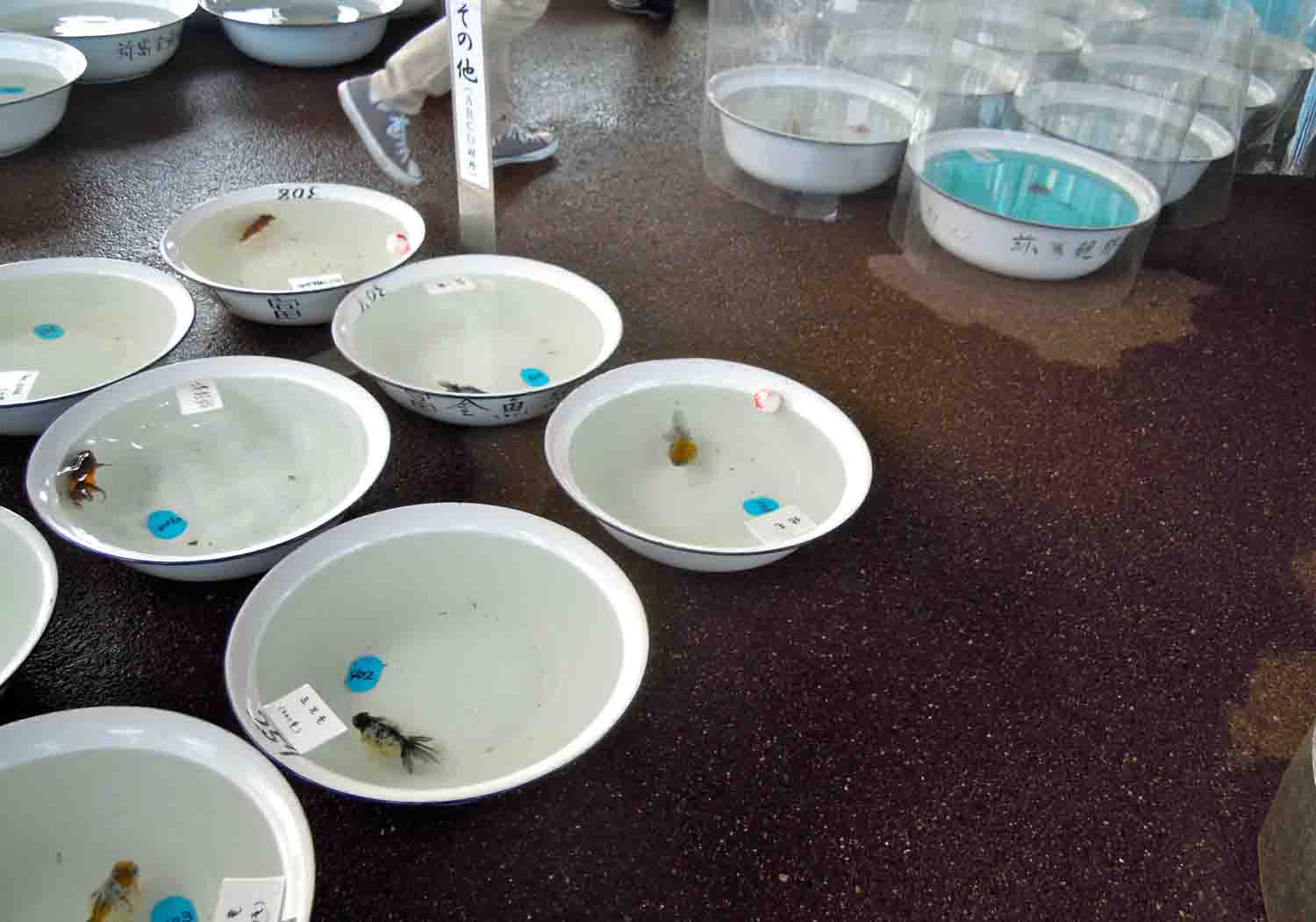5個、別々の洗面器に入ったところでA、B、C、D、Eの札を入れて、