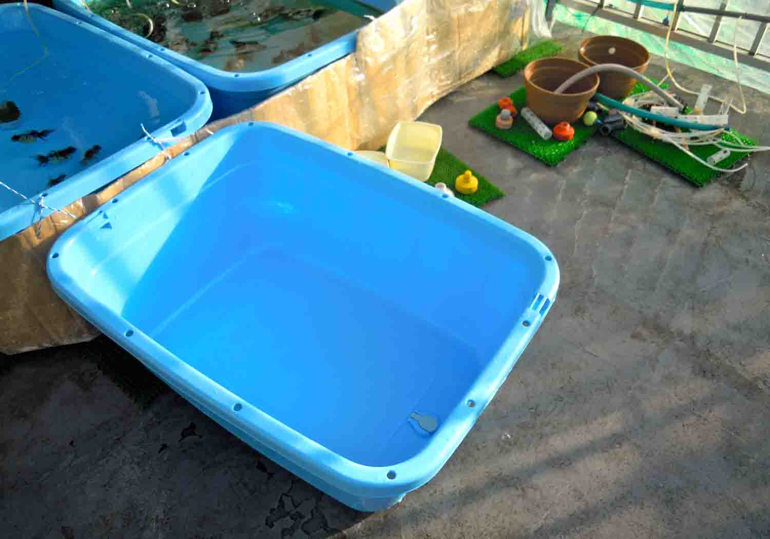その休憩部屋の一部を片付けて80Lのジャンボタライ3個と